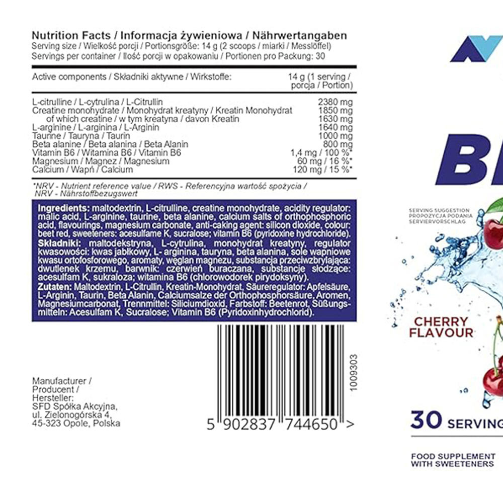 Suplement diety. Zawiera substancję słodzącą. Przeznaczony dla osób aktywnych fizycznie powyżej 18 roku życia. Nie stosować w przypadku uczulenia na którykolwiek ze składników. Nie przekraczać zalecanej dziennej porcji do spożycia. Suplementy diety nie powinny być stosowane jako substytut zróżnicowanej diety. Zalecana jest zrównoważona dieta i zdrowy tryb życia. Beta-alanina może powodować łagodne uczucie mrowienia u osób wrażliwych. Może zawierać pochodne zbóż zawierających gluten, soi i mleka. Produkt może ulegać zbrylaniu, jednak nie wpływa to na jego właściwości. Po każdym użyciu opakowanie należy szczelnie zamknąć.