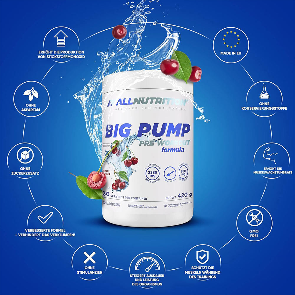 ALLNUTRITION BIG PUMP PRE WORKOUT to formuła przedtreningowa stworzona dla sportowców siłowych, którzy chcą poczuć efekt pompy podczas treningu bez potrzeby dodatkowej stymulacji. Formuła dostępna jest w różnych smakach i łatwo rozpuszcza się w wodzie, dzięki czemu przygotowanie napoju przedtreningowego jest szybkie i wygodne.