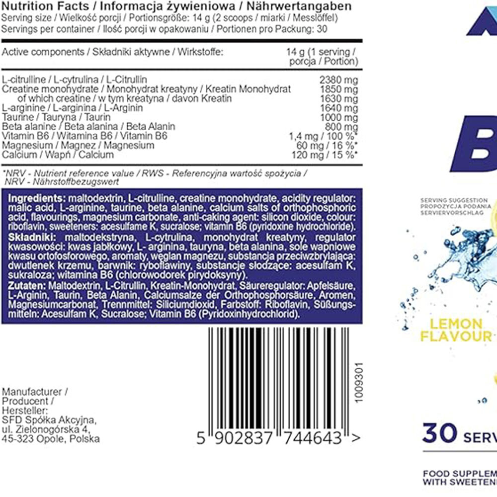 Suplement diety. Zawiera substancję słodzącą. Przeznaczony dla osób aktywnych fizycznie powyżej 18 roku życia. Nie stosować w przypadku uczulenia na którykolwiek ze składników. Nie przekraczać zalecanej dziennej porcji do spożycia. Suplementy diety nie powinny być stosowane jako substytut zróżnicowanej diety. Zalecana jest zrównoważona dieta i zdrowy tryb życia. Beta-alanina może powodować łagodne uczucie mrowienia u osób wrażliwych. Może zawierać pochodne zbóż zawierających gluten, soi i mleka. Produkt może ulegać zbrylaniu, jednak nie wpływa to na jego właściwości. Po każdym użyciu opakowanie należy szczelnie zamknąć.