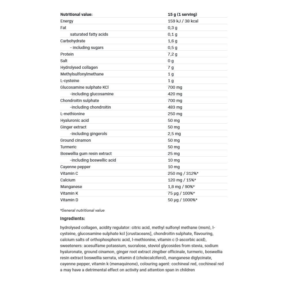 Przy dawce 15 g proszku wspiera regenerację tkanki łącznej i komfort stawów