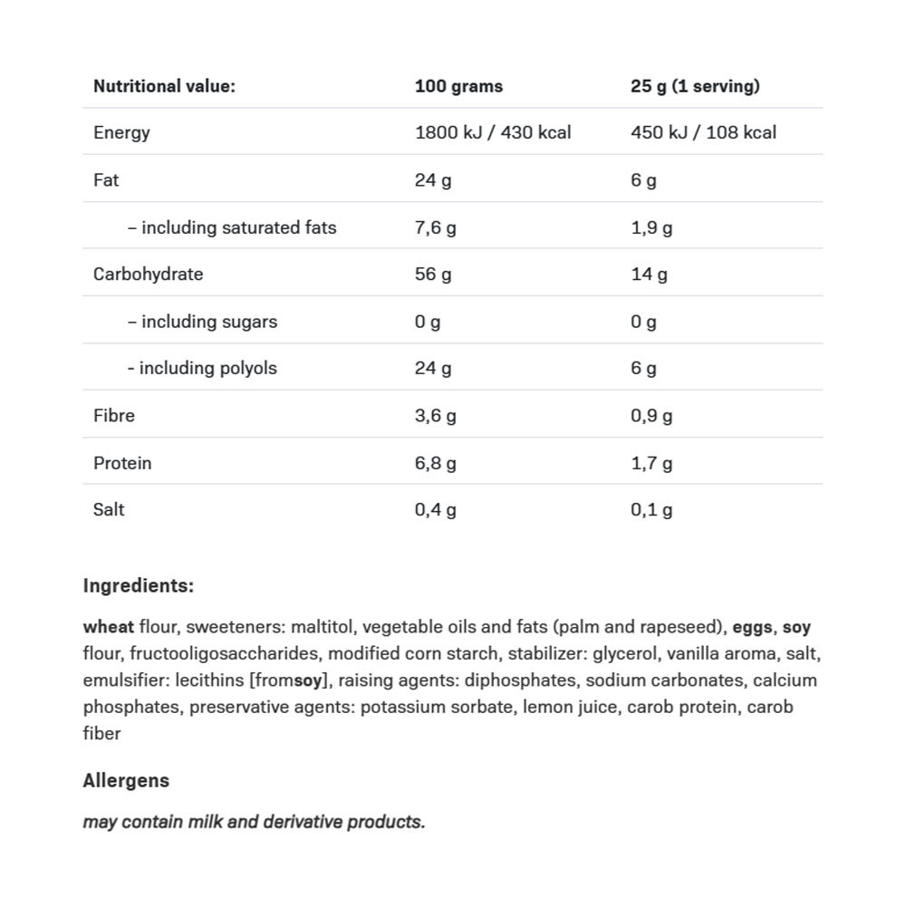 Wafel o smaku waniliowym bez cukru. Zawiera substancję słodzącą. Nadmierne spożycie może wywołać efekt przeczyszczający. Nie spożywać w przypadku alergii (nadwrażliwości) na którykolwiek ze składników. Może zawierać produkty mleczne i pochodne mleka.