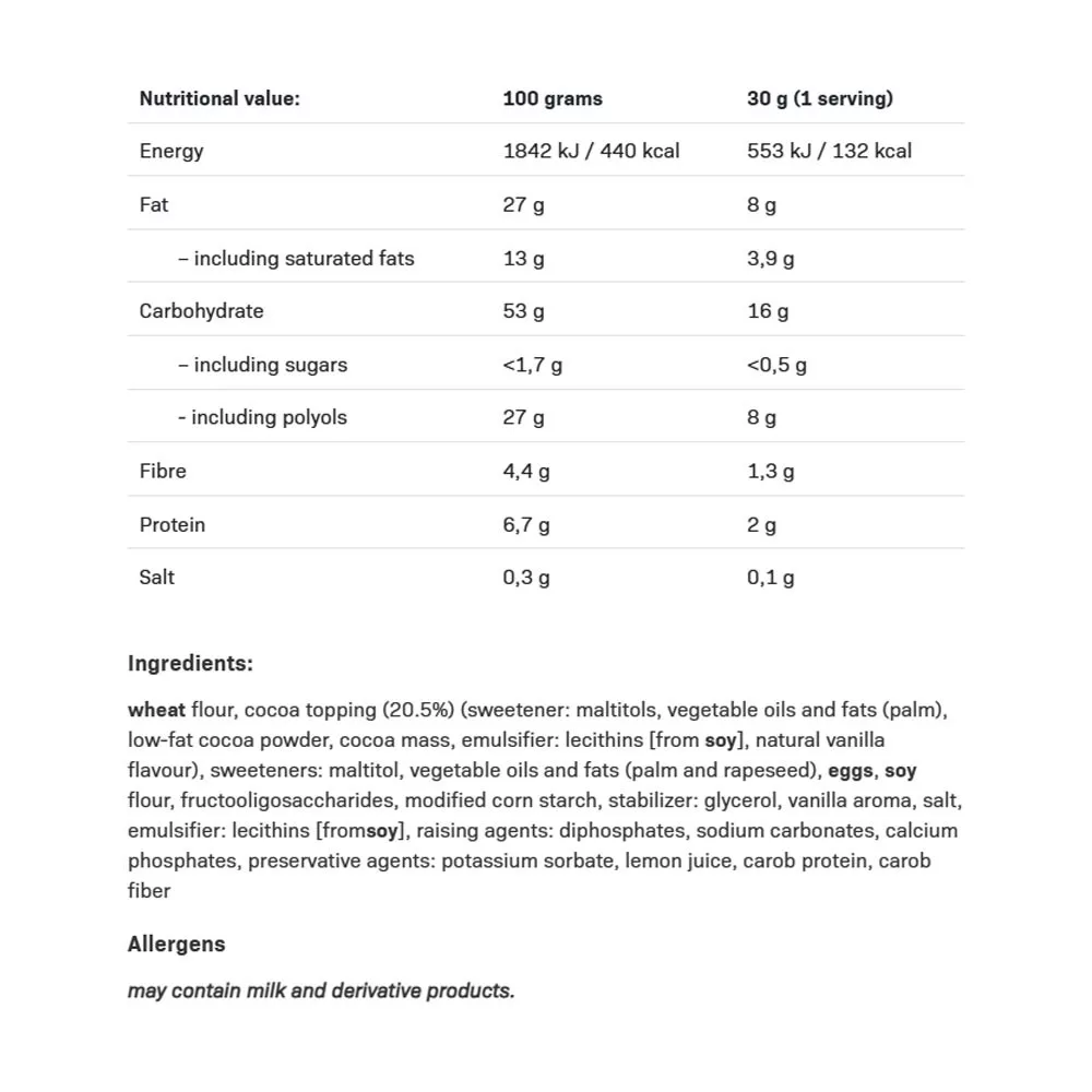 Wafel o smaku waniliowym z bezcukrową polewą kakaową. Zawiera słodzik. Nadmierne spożycie może wywołać efekt przeczyszczający. Nie spożywać w przypadku alergii (nadwrażliwości) na którykolwiek ze składników. Produkt może zawierać mleko i produkty pochodne od mleka.