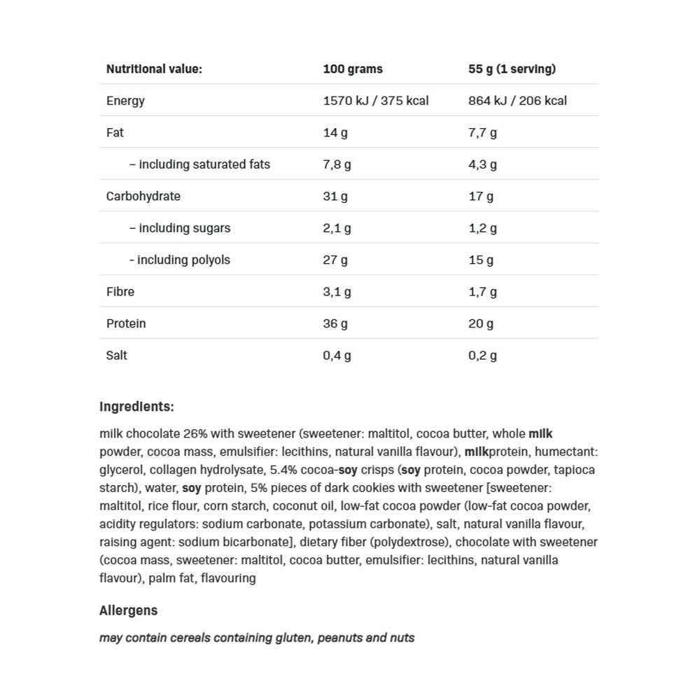 Ten produkt nie jest substytutem zróżnicowanej diety. Zawiera naturalnie występujące cukry. Zalecana jest zrównoważona dieta i zdrowy styl życia. Nadmierne spożycie może mieć efekt przeczyszczający. Może zawierać jaja, orzechy, orzeszki ziemne oraz zboża zawierające gluten.