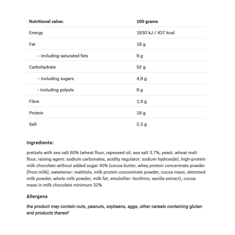 Precle solone oblane czekoladą mleczną (40%), o wysokiej zawartości białka, bez dodatku cukru. Zawiera substancję słodzącą. Zawiera naturalnie występujące cukry. Źródło białka. Nie spożywać w przypadku uczulenia na którykolwiek ze składników. Zalecana jest zrównoważona dieta i zdrowy styl życia. Produkt może zawierać orzechy laskowe, orzeszki ziemne, soję, jaja, inne zboża zawierające gluten oraz ich pochodne.