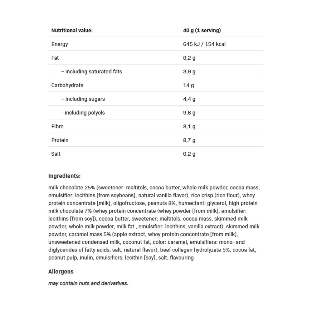 ALLNUTRITION FITKING PROTEIN SNACK BAR to pyszny, wysokobiałkowy baton stworzony z starannie dobranej mieszanki składników. Wypełniony jest miękkim, aksamitnym nadzieniem, oblany mleczną czekoladą z chrupiącymi orzechami – wszystko to bez dodatku cukru!