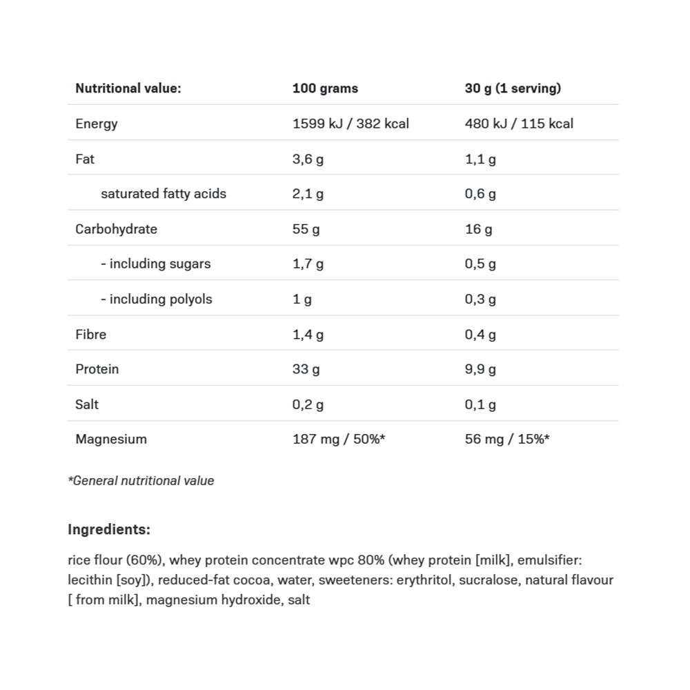 ALLNUTRITION PROTEIN RICE PORRIDGE to smaczny deser na bazie mąki ryżowej i koncentratu białka serwatkowego (WPC). Dodatkowo, PROTEIN RICE PORRIDGE została wzbogacona magnezem, który wspiera prawidłowe funkcjonowanie mięśni i przyczynia się do efektywnej syntezy białek.