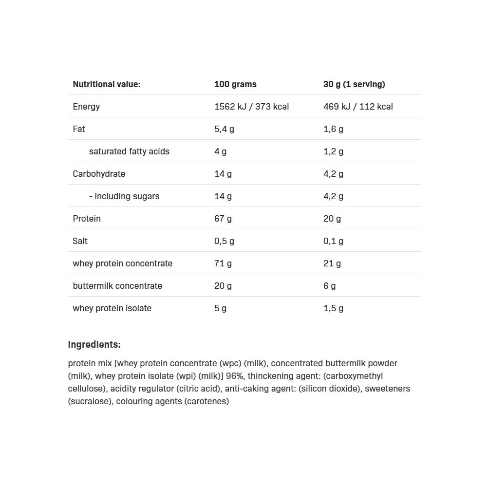Nie spożywać w przypadku uczulenia na którykolwiek ze składników. Może zawierać soję. Nieodpowiednie dla kobiet w ciąży lub karmiących piersią. Zalecana jest zbilansowana dieta i zdrowy styl życia. Suplement ten nie powinien zastępować zróżnicowanej diety i jest przeznaczony głównie dla osób aktywnych. Nie przekraczać zalecanej dziennej porcji do spożycia. Zawsze szczelnie zamykać opakowanie po otwarciu. Wartości odżywcze mogą się nieznacznie różnić w zależności od smaku. Zawartość białka podana jest w przeliczeniu na suchą masę.