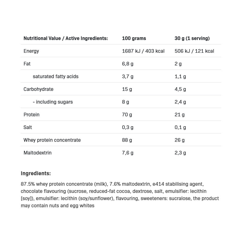 Najlepiej spożywać między posiłkami. Przeznaczony dla sportowców: nie zastępuje zróżnicowanej diety. Nie przekraczać zalecanej dziennej dawki. Przechowywać w miejscu niedostępnym dla dzieci. Może zawierać śladowe ilości lecytyny, orzechów oraz innych białek zwierzęcych. Zawartość białka podana na suchą masę.