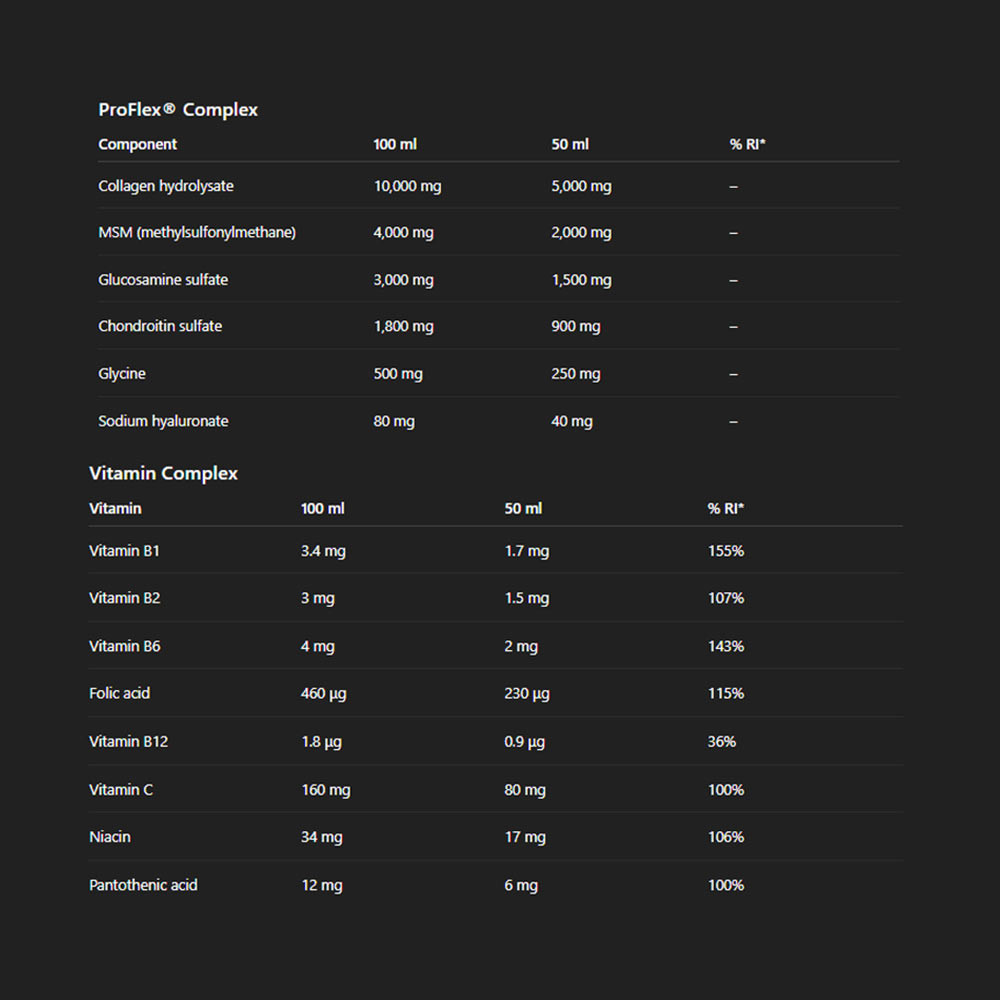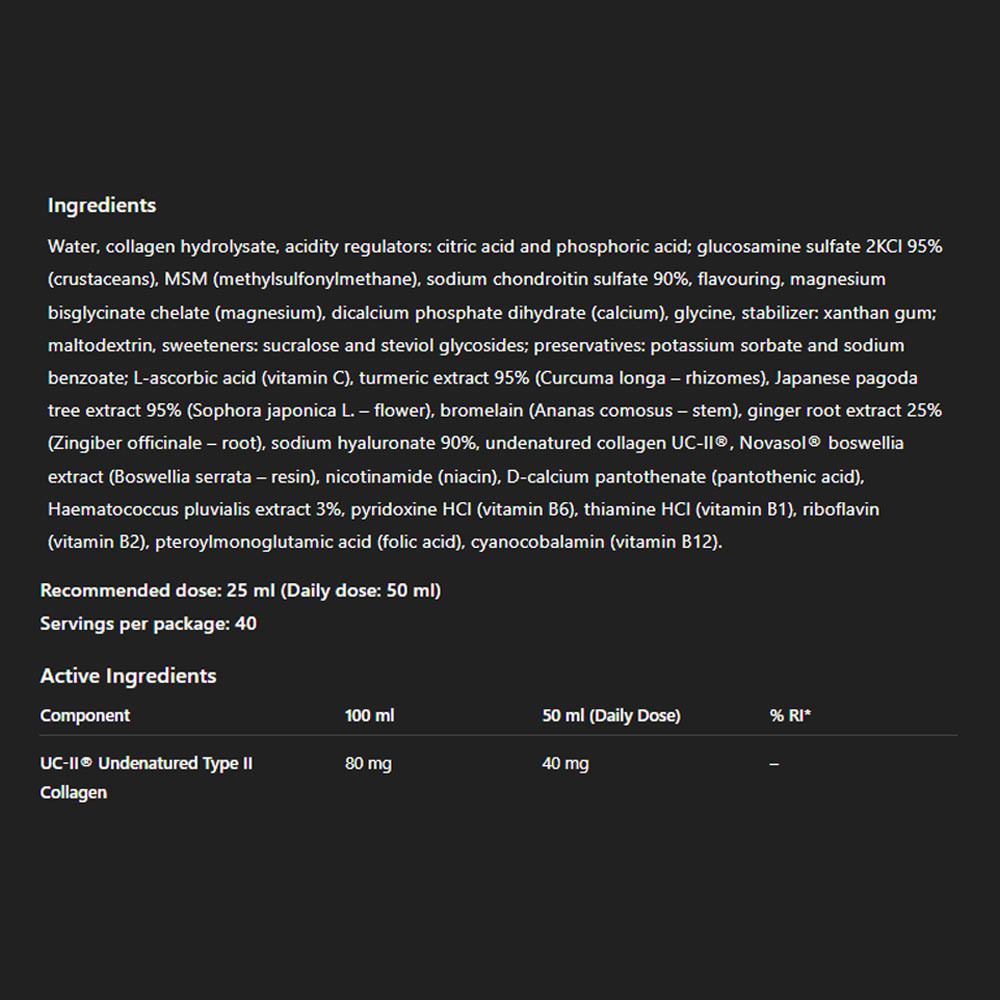 Amix™ ProFlex ® Collagen liquid to koncentrat do przygotowania smacznego napoju pełnego witamin, minerałów, kompleksu ziołowego oraz kompleksu aktywnych składników zawierających hydrolizaty kolagenu – szczególnie UC-II ® niezdenaturowany kolagen typu II, siarczan glukozaminy, MSM, siarczan chondroityny, hialuronian sodu i glicynę.