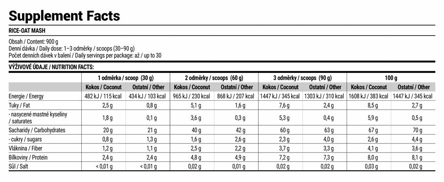 Bazą tego produktu jest 100% ryż w postaci błyskawicznych płatków ryżowych, które stanowią 80% złożonych źródeł węglowodanów w RICE-OAT MASH. Pozostałe 15% węglowodanów złożonych stanowią płatki owsiane, a 5% płatki pszenne. Zacier jest wzbogacony błonnikiem inulinowym z korzenia cykorii