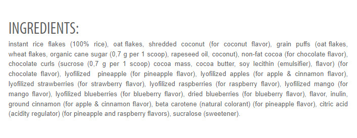 - Kompleks węglowodanów: 80% ryżu, 15% płatków owsianych i 5% płatków pszennych