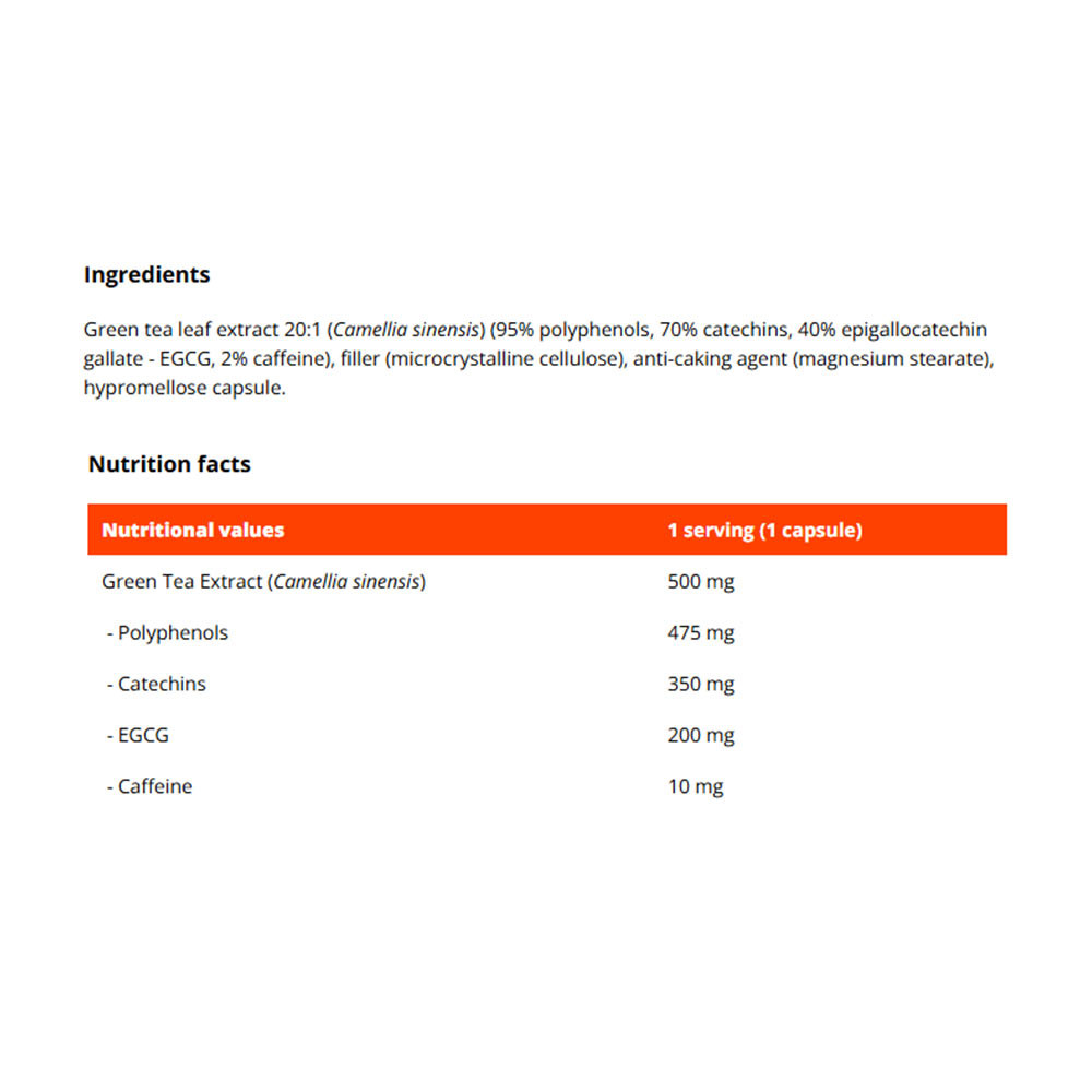 Suplement diety. Nie przekraczaj zalecanej dziennej porcji do spożycia. Produkt nie może być stosowany jako substytut zróżnicowanej i zbilansowanej diety. Zawiera kofeinę (10 mg w porcji dziennej). Nie zaleca się stosowania u dzieci poniżej 18 roku życia, kobiet w ciąży oraz karmiących piersią. Nie należy stosować, jeśli spożywasz inne produkty zawierające zieloną herbatę tego samego dnia. Nie spożywać na czczo. Nie spożywaj 800 mg lub więcej EGCG w ciągu dnia. Przechowywać w miejscu niedostępnym dla małych dzieci.