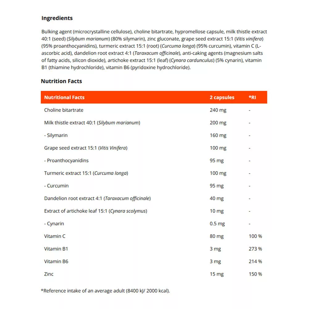 • zawiera ostropest plamisty oraz ekstrakty z pestek winogron, mniszka lekarskiego czy kurkumy