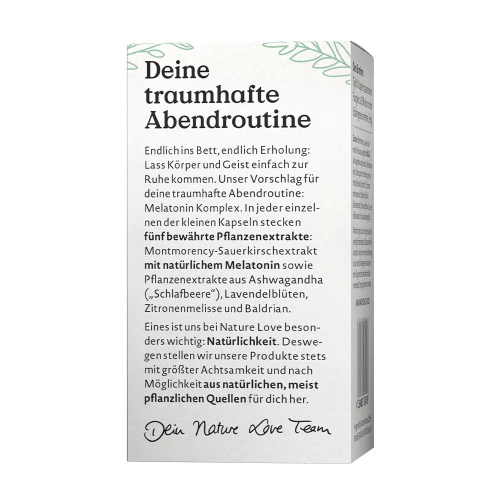 Bez GMOW końcu w łóżku, w końcu trochę odpoczynku: pozwól ciału i umysłowi po prostu się zrelaksować. Nasza propozycja na Twój wieczorny rytuał: Melatonin Complex. Każda z małych kapsułek zawiera pięć sprawdzonych i specjalnie dobranych ekstraktów roślinnych, w tym przede wszystkim prawdziwy ekstrakt z wiśni Montmorency z naturalną melatoniną. Melatoninę znasz jako naturalny „hormon snu” organizmu, który wspiera Twój cykl snu i czuwania – nawet wtedy, gdy Twój rytm zostaje zakłócony, na przykład przez jet lag. Dodatkowo w składzie znajdziesz delikatną ashwagandhę („jagoda snu”), a także kwiaty lawendy, melisę i kozłek lekarski. No dobrze, dobranoc.