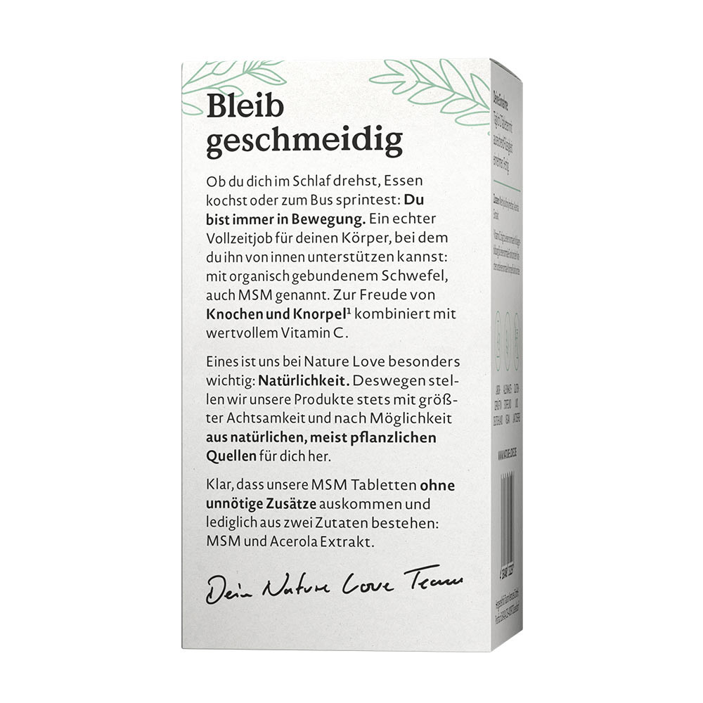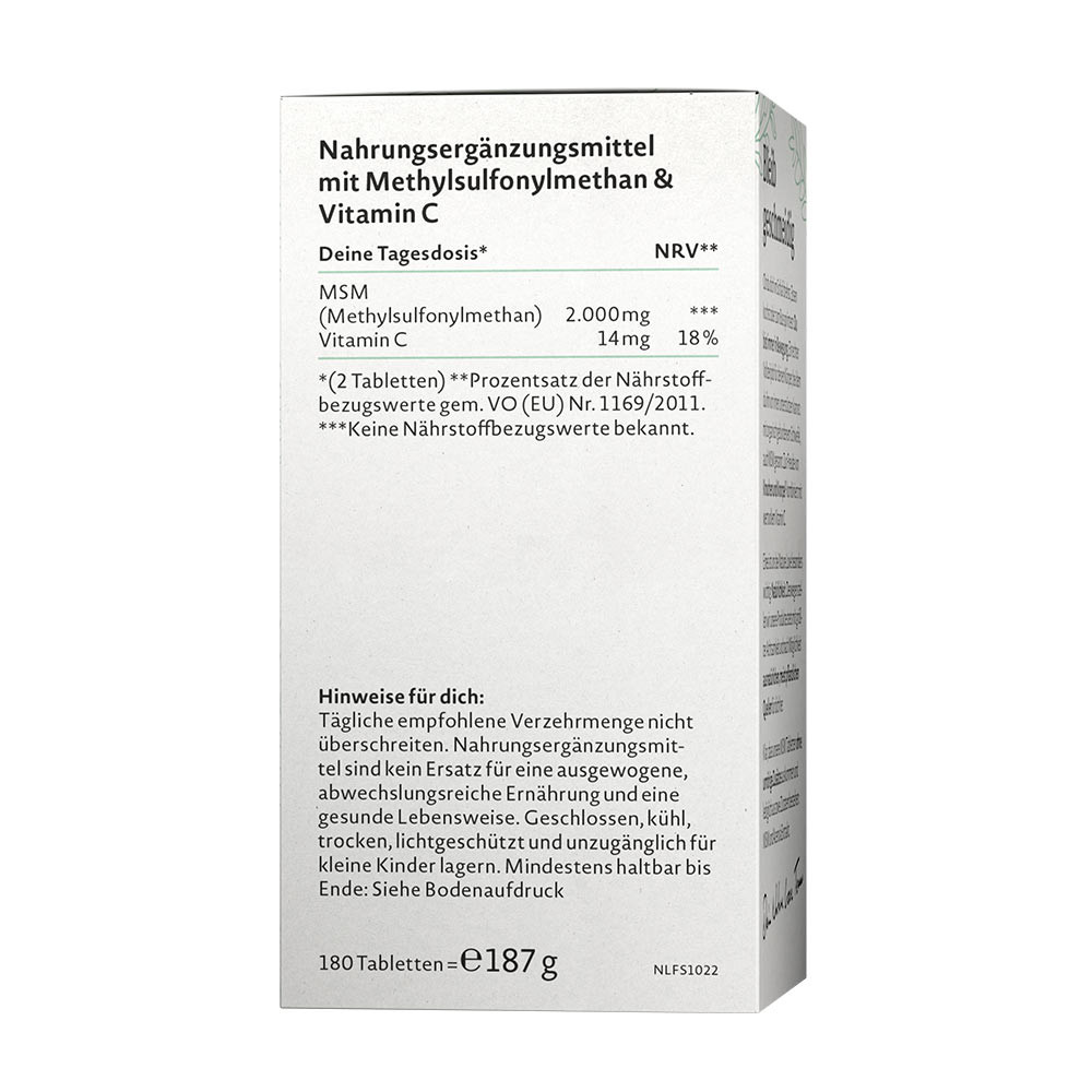 WegańskieNiezależnie od tego, czy wiercisz się w nocy, gotujesz posiłki, czy biegniesz na autobus – zawsze jesteś w ruchu. To prawdziwa praca na pełen etat dla twojego ciała, które możesz wspierać od wewnątrz: dzięki organicznie związanemu siarkowi, znanemu także jako MSM. Ku uciesze kości i chrząstek, został on połączony z cenną witaminą C. Nasze tabletki MSM nie zawierają zbędnych dodatków i składają się tylko z dwóch składników: MSM i witaminy C.