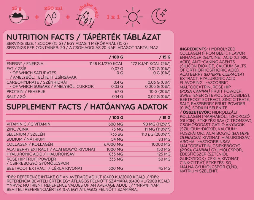 Produkt zawiera również kwas hialuronowy, białko, które stało się kamieniem węgielnym nowoczesnej pielęgnacji urody w XXI wieku. Jest popularnym suplementem ze względu na swoje korzyści dla urody, ale należy pamiętać, że jest również wytwarzany przez organizm w celu utrzymania stawów.