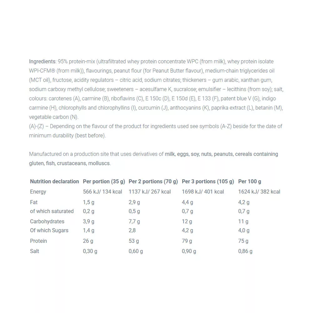 WHEY PROTEIN COMPLEX 100% – suplement diety. Zawiera cukier i substancje słodzące. Produkt aromatyzowany. Wysokobiałkowy koncentrat w proszku. Mieszanka wysokiej jakości ultrafiltrowanego koncentratu białka serwatkowego oraz izolatu białka serwatkowego. Produkt przeznaczony dla osób aktywnych fizycznie i sportowców, dążących do rozwoju masy mięśniowej. Białko przyczynia się do wzrostu i utrzymania masy mięśniowej.