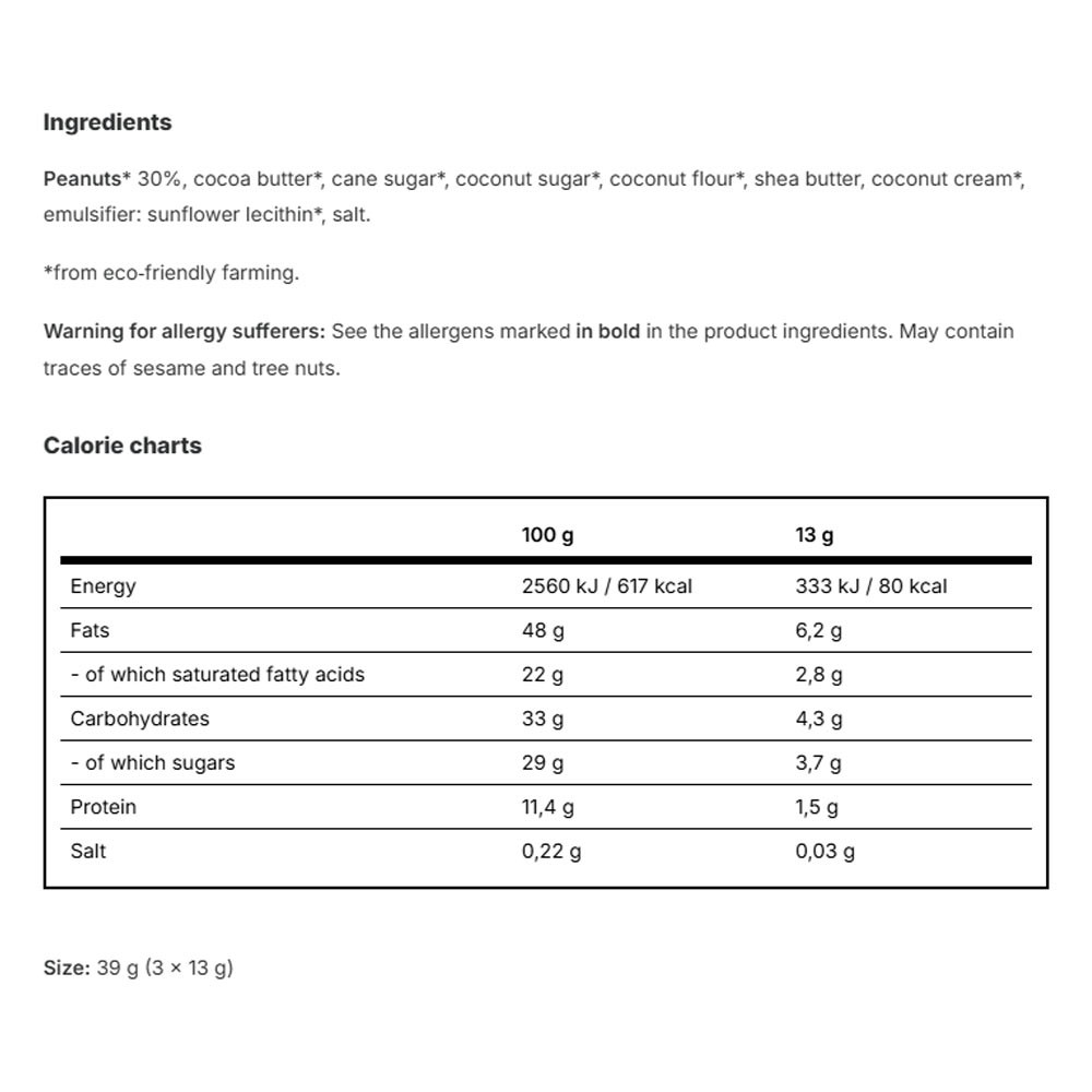Poczuj eksplozję smaku kakao i kremowego masła orzechowego, z tropikalną słodyczą cukru kokosowego w środku. Bez glutenu, bez laktozy, bez niskiej jakości olejów i zbędnych składników. 100% wegańska, 100% ekologiczna.