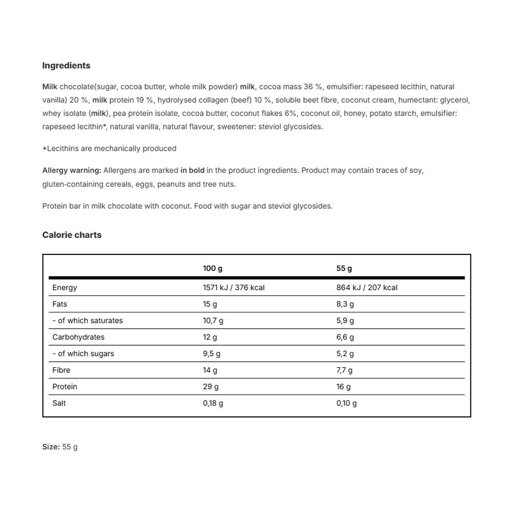 Dla maksymalnej przyjemności dla Twoich kubków smakowych połączyliśmy wiórki kokosowe z aksamitnym masłem kokosowym i solidną porcją pełnowartościowego białka. Dodatkowo cały baton pokryty jest najwyższej jakości mleczną czekoladą.