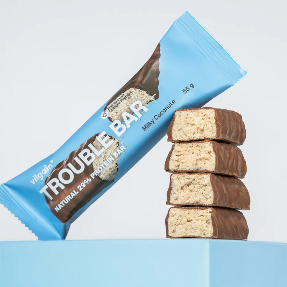 Nie daj się zwieść niezwykle bogatemu smakowi Trouble Bar! To wciąż baton proteinowy o wysokiej, 29% zawartości białka. Głównym składnikiem jest białko mleczne – jedno z najlepiej przyswajalnych. Matrycę białek uzupełniają dodatkowo białko serwatkowe oraz grochowe.