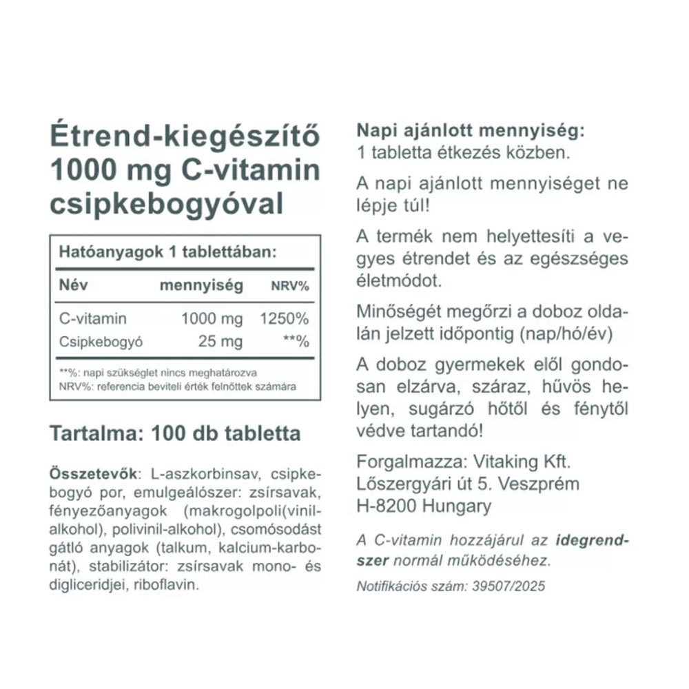 Witamina C jest jedną z najczęściej przyjmowanych witamin. Ma niezliczone funkcje w naszym organizmie i jest potrzebna niezależnie od wieku, płci czy pory roku. Ponieważ jest witaminą rozpuszczalną w wodzie, regularna suplementacja jest ważna. Vitaking Witamina C 1000 mg została wzbogacona o dodatek dzikiej róży. Dzika róża jest jednym z najlepszych naturalnych źródeł witaminy C.
