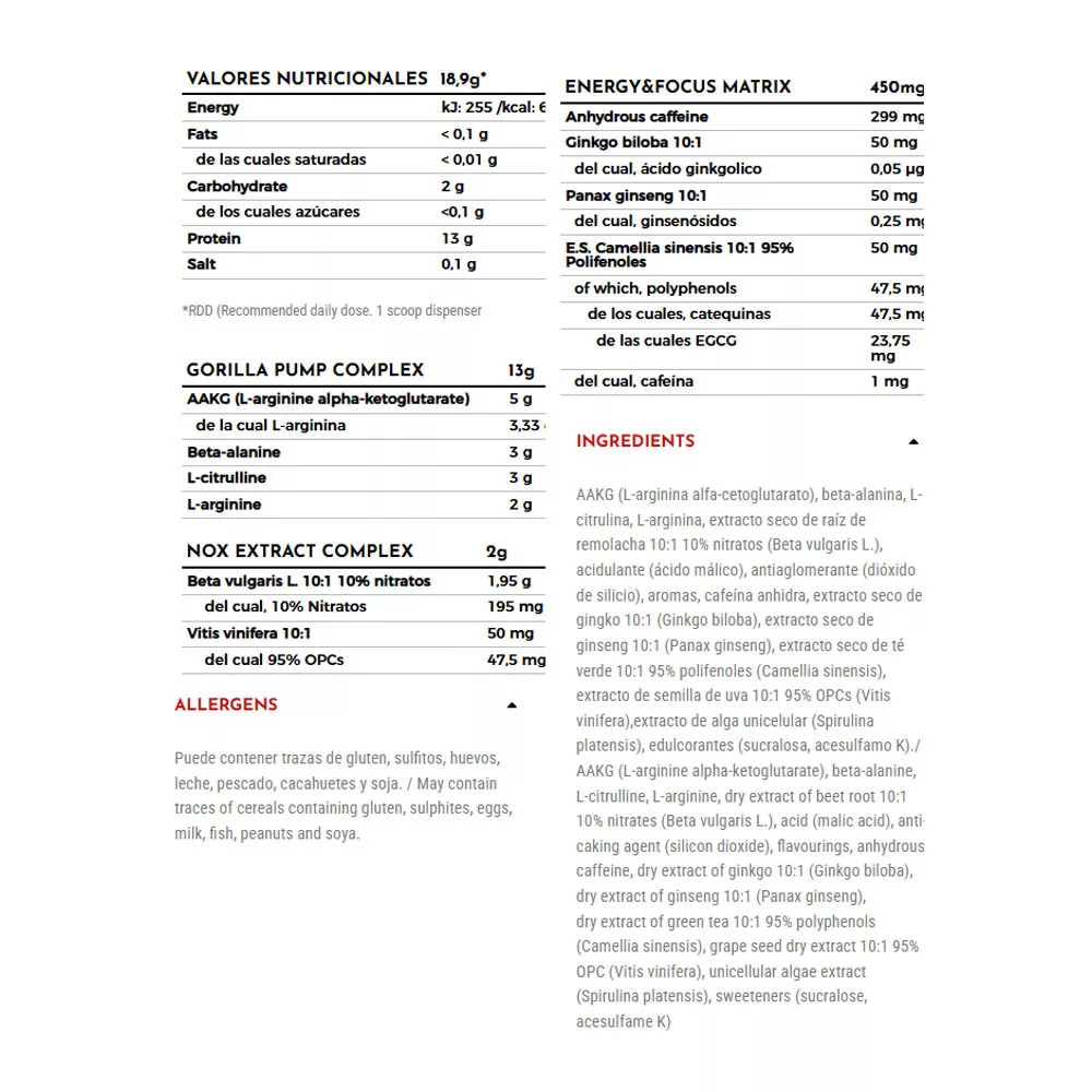 Połączenie 5 g AACG, 3 g jabłczanu cytruliny oraz 2 g beta-alaniny – aminokwasu wspierającego produkcję tlenku azotu – w dawkach rzadko spotykanych na rynku, wynosi efekt pompy mięśniowej na zupełnie nowy poziom.
